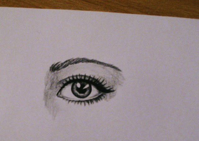 Następnie podkreślamy mocniejszym naciskiem ołówka części które mają być najciemniejsze. W moim przypadku jest to oko kobiece.